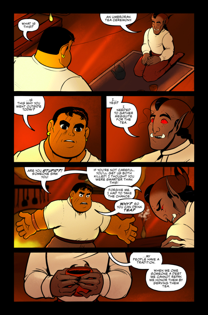 Chapter 12 Page 10 by David Kinne on December 27, 2022 at 3:00 am Chapter: Chapter 12: Solace But have you considered that tea is great and tastes rad? 2 Comments